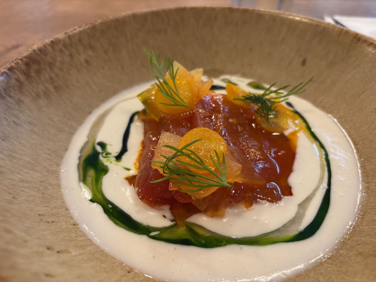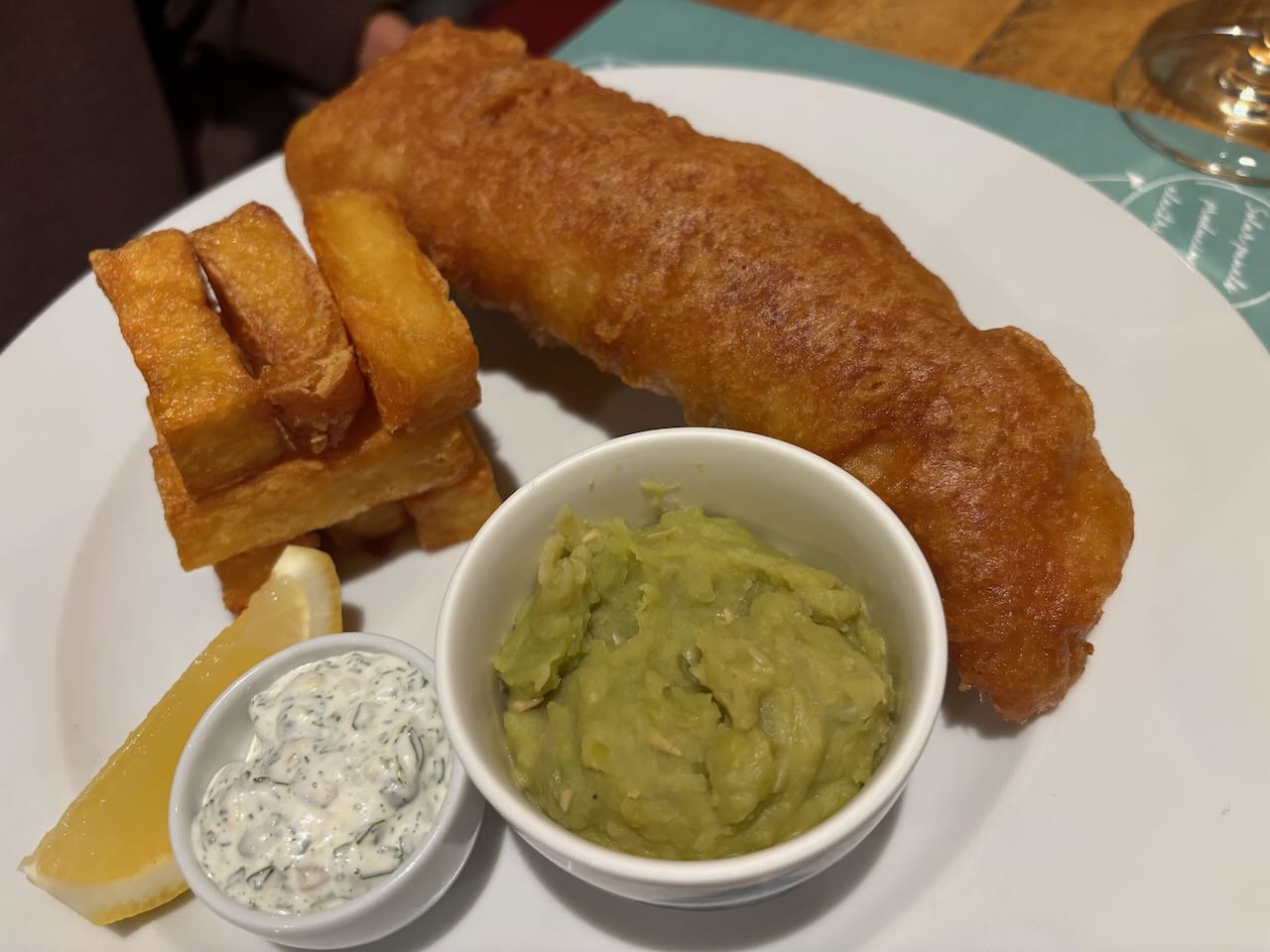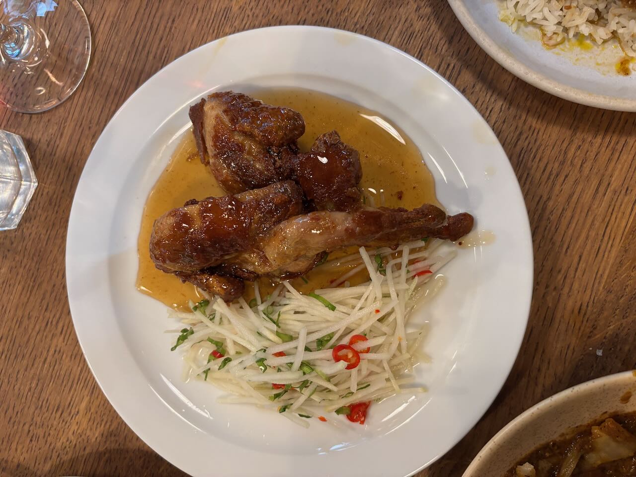 I started with cod cheeks, so delicately steamed they were translucent, and broken up into a lovely tartare sauce. Thin slices of sweet pickled cucumber and gooey blobs of egg yolk “jam” paired just beautifully with it, along with crisped wafers to scoop it all up. Maureen’s salt and pepper squid was absolutely nothing like you’re picturing it. Perfect chunks of soft squid with an almost barbecue-y flavour, with sweetly sticky bits of red pepper, crisp shards of serrano ham and black squid ink aioli, the whole lot melded perfectly in the mouth and I wish I’d ordered it!Anyway. My main made up for that. I went for chicken breast, unusually, because I loved the sound of the accompaniment: sweetcorn puree, chorizo, black onion ketchup, roast chicken salad cream. And fries. But the chicken breast was utterly perfect, firm, still bursting with juice, but with a nut brown and blackened skin full of harissa flavour. And the accompanying sauce and fripperies melted together into the most delicious relish you could imagine. Good fried, too. A side order of hispi cabbage was nicely charred on the edges with a lush mix of lime-chilli mayo and crispy crumb swiped over it.