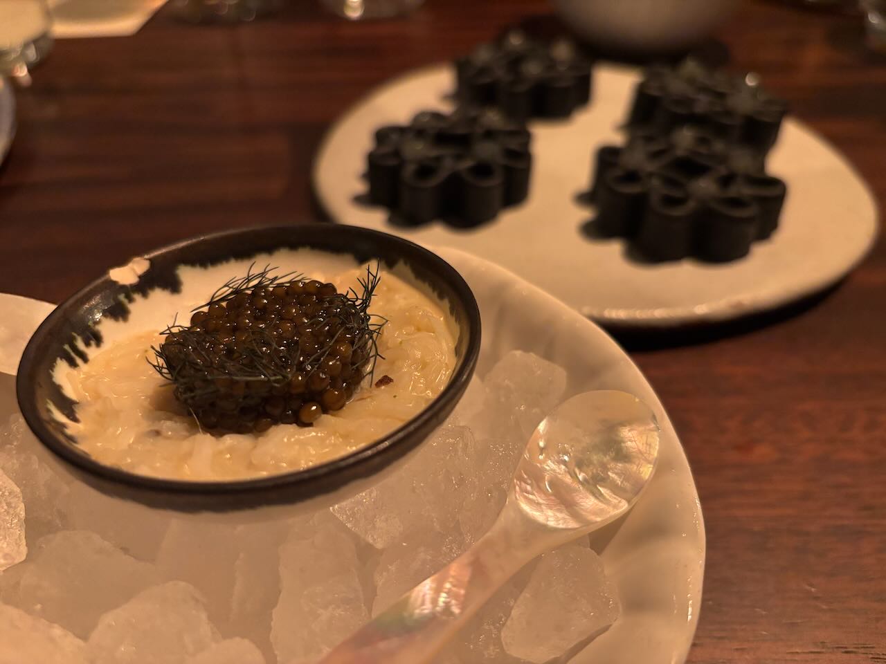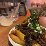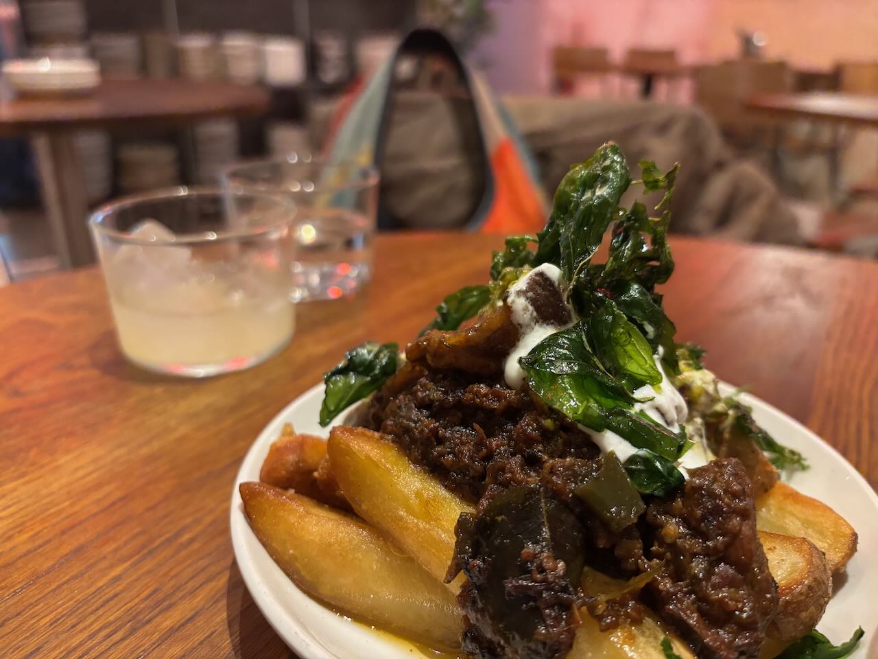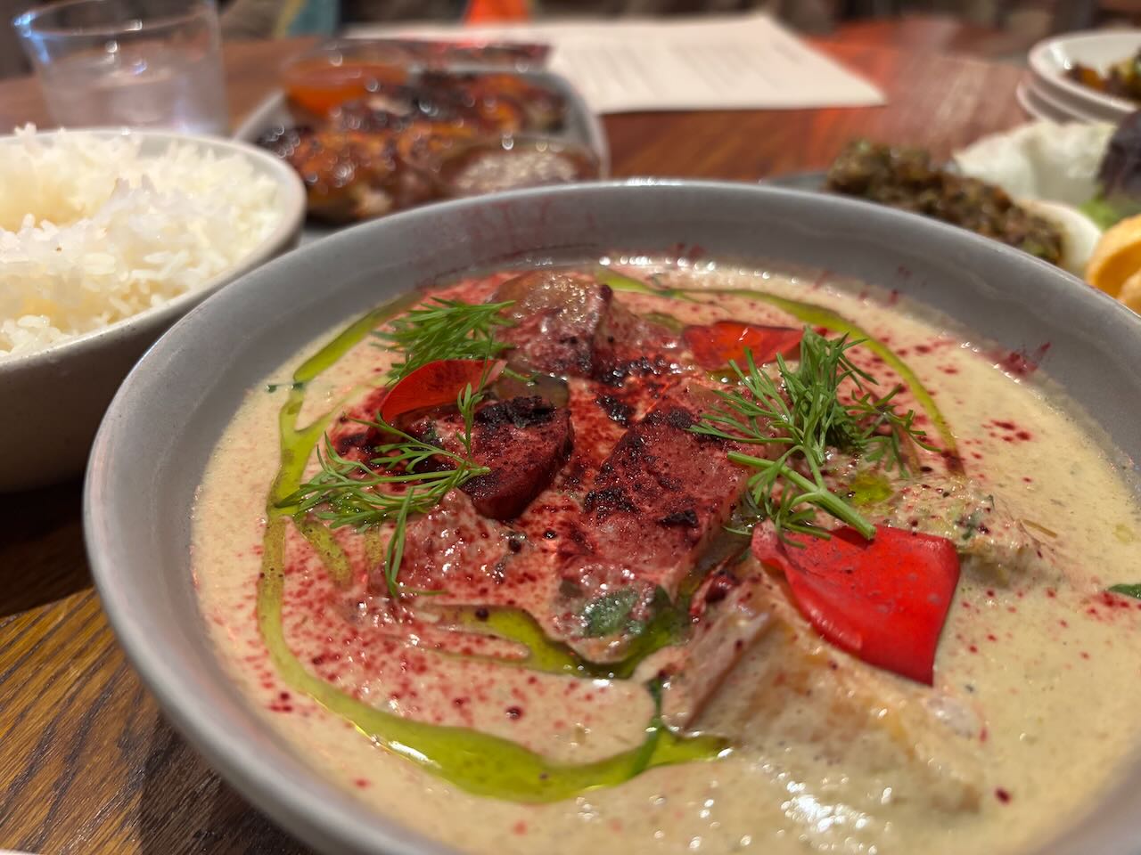 I started with cod cheeks, so delicately steamed they were translucent, and broken up into a lovely tartare sauce. Thin slices of sweet pickled cucumber and gooey blobs of egg yolk “jam” paired just beautifully with it, along with crisped wafers to scoop it all up. Maureen’s salt and pepper squid was absolutely nothing like you’re picturing it. Perfect chunks of soft squid with an almost barbecue-y flavour, with sweetly sticky bits of red pepper, crisp shards of serrano ham and black squid ink aioli, the whole lot melded perfectly in the mouth and I wish I’d ordered it!Anyway. My main made up for that. I went for chicken breast, unusually, because I loved the sound of the accompaniment: sweetcorn puree, chorizo, black onion ketchup, roast chicken salad cream. And fries. But the chicken breast was utterly perfect, firm, still bursting with juice, but with a nut brown and blackened skin full of harissa flavour. And the accompanying sauce and fripperies melted together into the most delicious relish you could imagine. Good fried, too. A side order of hispi cabbage was nicely charred on the edges with a lush mix of lime-chilli mayo and crispy crumb swiped over it.
