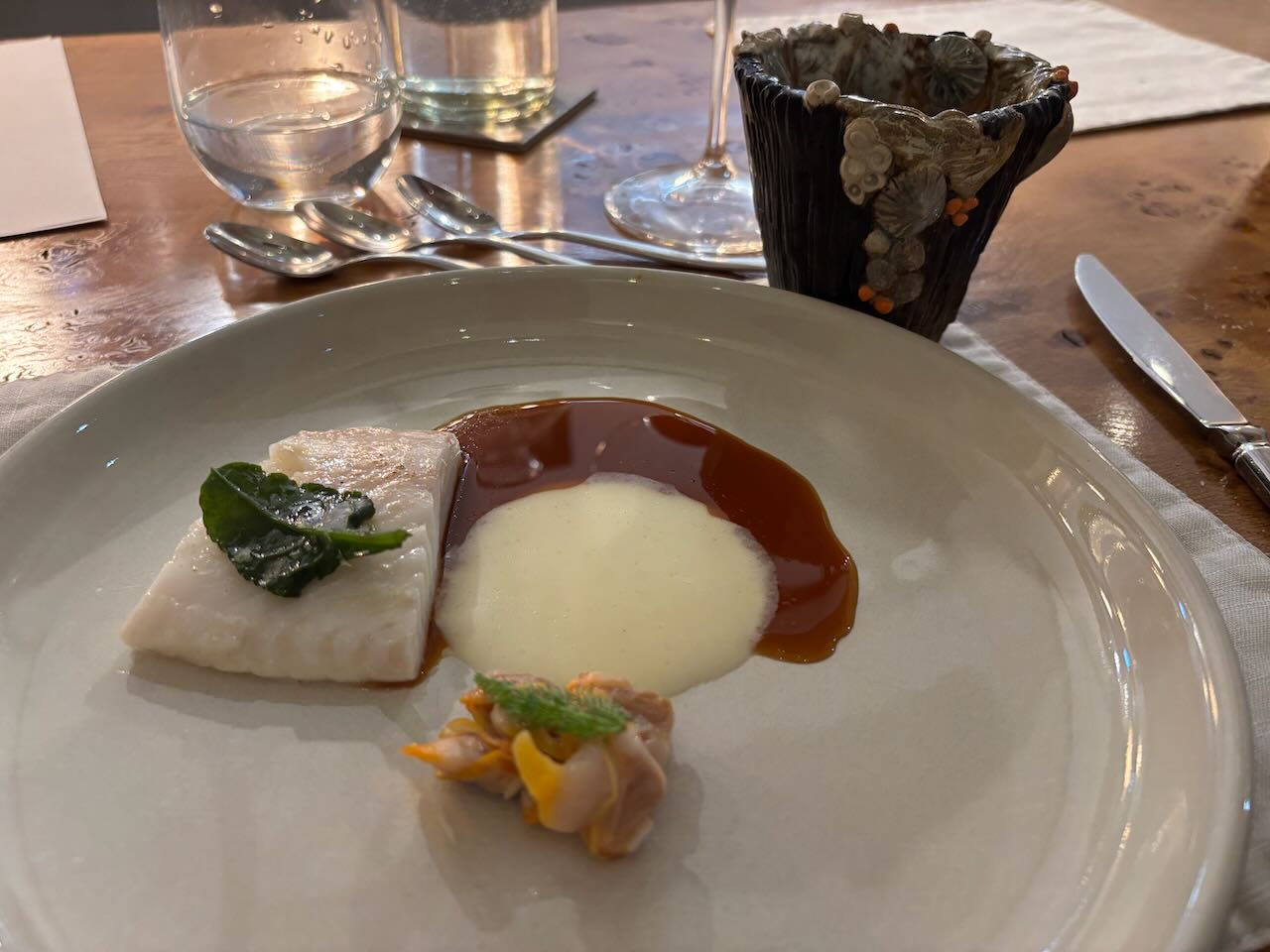 The actual main course, then, was the locally caught brill. The fish itself was a beauty, so softly cooked that it swooned winsomely on the fork. The dark reduction with this one, rich from roast fish bones, was the same mirror-like glossiness as the mutton gravy, and so good with the fish. There was a great side-serving as well, of a brown crab mousse that was as powerful as any sea urchin dish I’ve ever tried, and also wonderful scoffed with the fish. Probably the star dish, appropriately.